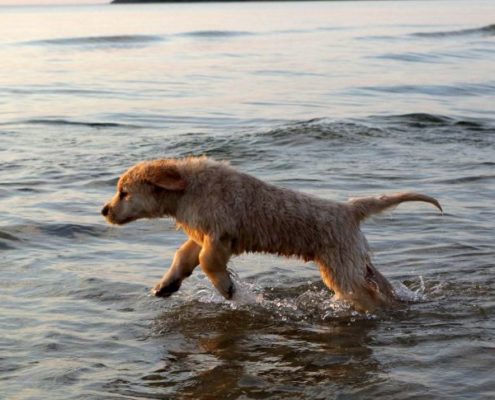 We had for long time admired Bennito’s father Joe from afar. He was our choice for unrealised Rianna’s U-litter. When we learned of Mareluna’s breeding plans we immediately let them know that we are interested in a boy. Bennito was born as the only puppy, and we didn’t hesitate: if the breeders allow, this boy would come to Estonia. Luckily they agreed. Bennito adjusted well to new situations and life, and his new friends turned out to be exciting. As a lone puppy he has also learned to be alone and play by himself, at the same time, he learned quickly to wrestle with other puppies. He is bold, but not overmuch, full of natural curiosity and puppy mischief, but also balanced and steady. A natural born gundog and a boy full of charisma with a permanent smile in his face. Bennito first time by the sea.