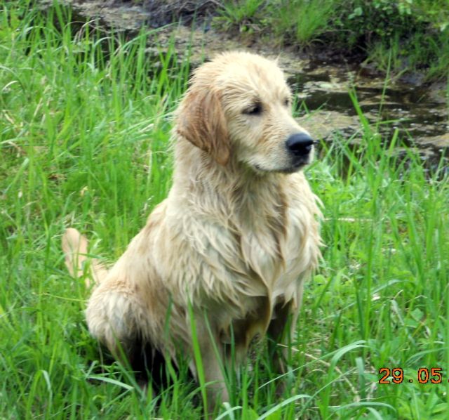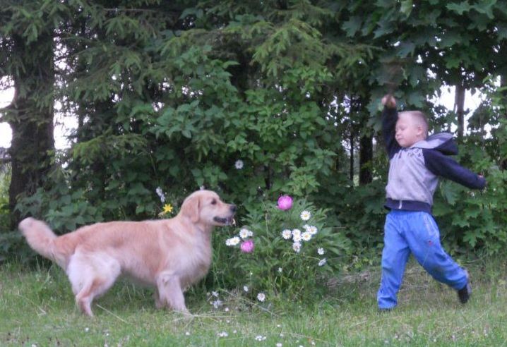 Monty was a puppy who dug himself into our hearts so that I planned to keep him initially. However, Kristin’a serious illness required changed and we had to look for a new permanent home for Monty. When Elen’s family came to see him, it was mutual sympathy from the first glance. To our greatest joy Monty found a playmate in 5-year-old Chris, showperson in Elen (who went to handling and ringcraft courses and has shown Monty successfully), and breed training enthusiast in Vladi. Monty has grown into a sweet- and soft-natured young dog (with a streak of mischief) who is very social and willing to please, adores water (and mud), enjoys digging and carrying all kind of items in his mouth.
